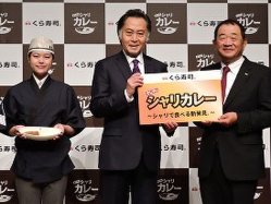 回転ずしチェーン「無添くら寿司」を運営する「くらコーポレーション」(堺市)は、すし用の酢飯(シャリ)を使った「すしやのシャリカレー」を29日、発表した。東京都内で開かれた発表会には、CMキャラクターを務める俳優の北大路欣也さんも登壇し、「カレー好きな方に楽しんでいただきたい」とPRした。