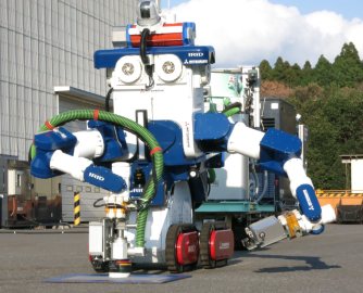 ロボットは、除染作業用や機器の搬送用台車など4台を連結させて造った。5階建ての建屋の2、3階の除染に活用し、アームの先端から高圧水を噴射して表面を洗い流したり、床を研磨して吸引したりと、放射性物質を取り除く4種類の機能を持つ。