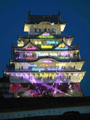 7日夜は、姫路城・三の丸広場側の4台の投影機が、日本語や中国語、ドイツ語、タイ語などの「ありがとう」を大天守南側の壁面に一斉に映し出した。【山縣章子】