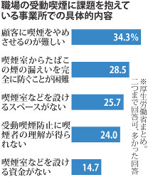 「顧客のたばこをやめさせられない」「喫煙室を作る場所がない」--。職場での受動喫煙防止の取り組みで、何らかの課題を抱えている事業所が42・6%に達するとの調査…