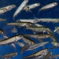 福岡県嘉麻市のふ化場でサケの稚魚約4万匹がすくすくと成長し、遠賀川源流から引いた水が流れる水槽で旅立ちの時を待っている。 「遠賀川源流サケの会」(青木宣人会長…