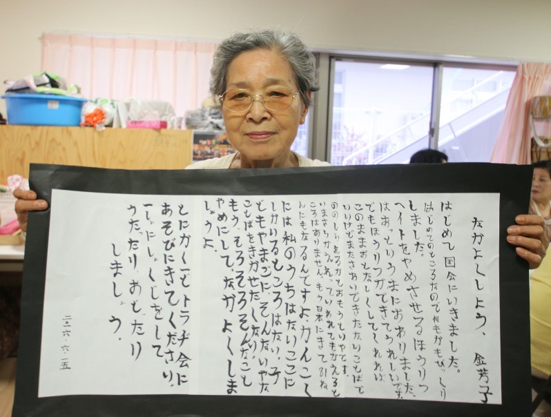 One of the participants in the anti-security laws protest, first-generation Korean immigrant Kim Bang Ja, 85, is also a student of literacy at the Fureai-kan. She was about 5 when she came to Japan, following her father who worked in a coal mine in Yamaguchi Prefecture. Busy with looking after her younger sister and doing household chores, she says she was only able to go to school for about one year. When the anti-hate law was passed in May this year, she was sitting as an observer in the Diet. She wrote her impressions about the law in a composition in her literacy class.