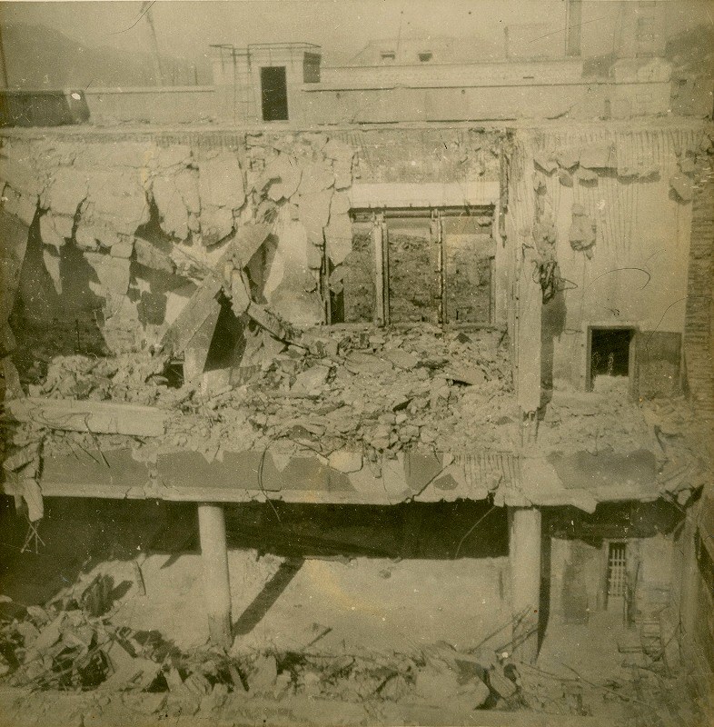 爆風を受けた屋根が崩れ落ちた農林中央金庫広島支所=金井清氏・前田敏雄氏撮影 -
