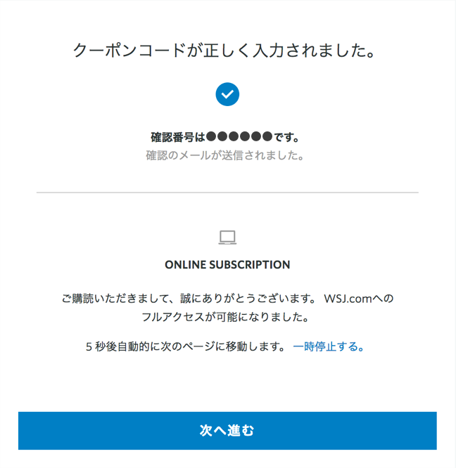 「クーポンコードが正しく入力されました。」と表示されたら、「次へ進む」をクリック。何もしなくても5秒後に次のページに移ります。