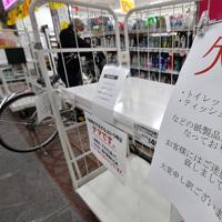 トイレットペーパーやティッシュペーパーの欠品で棚が空になった薬局=大阪市北区で2020年3月1日午後6時15分、木葉健…