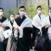 マスクを着用し卒業式に向かう宝塚音楽学校の卒業生=兵庫県宝塚市で2020年3月2日午前8時55分、梅田麻衣子撮影