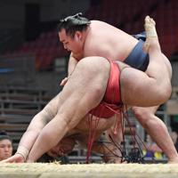 ◇大相撲春場所5日目 平幕の御嶽海が大関・貴景勝を一方的な攻めで寄り切り、7場所ぶりに無傷の5連勝。立ち合いで右を差し、左のはず押しで相手の上体を起こすと、一…