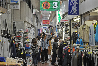 通路の幅は約2メートル。古着店や飲食店、ギャラリー、中古家電の部品の販売店など多様な店が点在し、「バッタ商品安売り」の看板や山積みされたレコードも目に入る。平日の人出こそ多くないが、週末限定の店も多く土日は人だかりができる店もある。賃料が周辺より安く、若者の出店も近年増えているという。