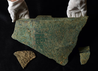 最大のもので横幅37.4センチ、高さ24.6センチ、厚さ約1.5センチの青銅製破片が、東側敷地で計3個見つかった。塔の屋上から突き出た「相輪」の一部で、輪を9個重ねた「九輪(くりん)」の破片とみられ、一部に金メッキが施されている。