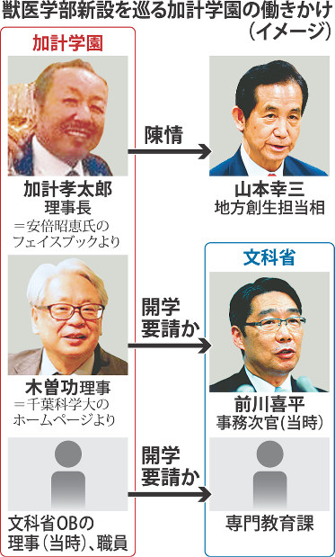安倍晋三首相の友人が理事長を務める学校法人「加計学園」(岡山市)が国家戦略特区で獣医学部を新設する計画を巡り、学園側が昨年夏から秋にかけ、文部科学省OBらさまざまなルートで同省などに働きかけを強めていた構図が浮かんできた。同省の前川喜平前事務次官は、当時内閣官房参与だった木曽功・千葉科学大学長から早期開学を要請されたと公表。また、前川氏が「別の文科省OBからも担当課に要請があった」と周囲に語っていることが関係者の話で分かった。