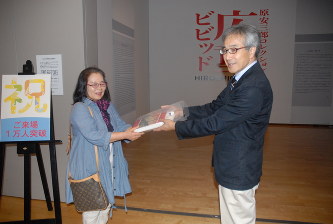 北九州市立美術館分館で開催中の「原安三郎コレクション 広重ビビッド」展(広重ビビッド展実行委員会=北九州市立美術館、RKB毎日放送、毎日新聞社=主催)の入館者が12日、1万人を超えた。1万人目の宗像市在住、坂井千里さんに西村勇晴(いさはる)館長から記念の目録が贈呈された。