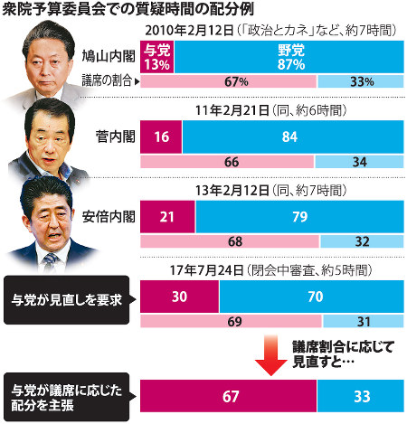 見直しを主導したのは安倍晋三首相や菅義偉官房長官ら官邸側だと思われる。菅氏は「議席数に(時間配分も)応じるのは国民からすればもっともだ」と踏み込んでいる。