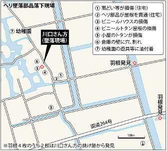 周辺の被害は、ヘリが墜落した川口貴士さん(35)方から約200メートルの範囲で確認され、7棟のうち2棟が住宅だった。川口さん方の南東約60メートルの住宅では部品が屋根を貫通して天井に穴が開き、この家の隣の住宅でも雨どいが損傷した。この他、周辺の小屋や倉庫、ビニールハウスでも屋根や壁などに穴や亀裂などが入り、北西約200メートルの大立寺幼稚園では遊具などにヘリの油が付着していた。