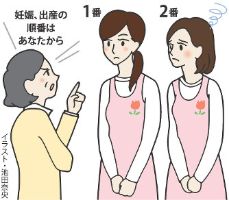 化粧品関連会社で働く東京都三鷹市の女性(26)は昨年、職場の女性リーダーに「出産は35歳ごろに」と指示された。自分と同僚女性社員の計23人の「出産・育児ローテーション表」がメールで配布され、「同時に4人以上休むと業務が滞る。勝手な行動は処罰の対象になる」などと注意書きまであった。