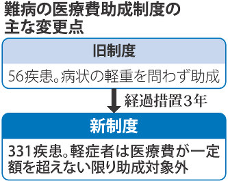 難病法が2015年1月に施行され、国は医療費を助成する病気の数を拡大した一方、全体の助成額を抑えるため軽症者を対象から原則外した。ただ、同法施行前から助成を受けてきた患者については、昨年12月末まで病状の軽重に関わらず助成を続ける3年間の経過措置が取られてきた。