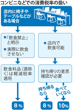 軽減税率は飲食料品に適用され、外食と、小売店の飲食スペースで飲食する場合の税率は10%になる。店内飲食スペースがある場合、会計の際、客に持ち帰りか店内で飲食するかを確認する必要がある。
