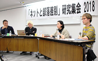 インターネット上で深刻な問題となっている差別的な投稿について考える「『ネットと部落差別』研究集会」(部落解放・人権研究所主催)が15日、港区波除のHRCビルで開かれた。シンポジウムで、山口県人権啓発センターの川口泰司、ジャーナリストの津田大介、大阪国際大准教授の谷口真由美、評論家の荻上チキの各氏が、どうネット上の人権侵害を防ぐかで意見を交わした。