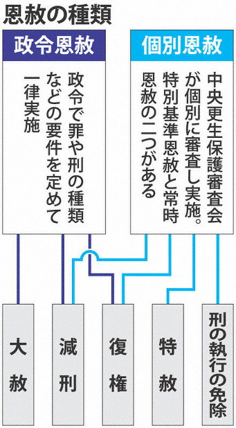 恩赦の実施方法は、対象の刑や罪などを政令で決めて救済する「政令恩赦」と、本人の申請に基づき中央更生…