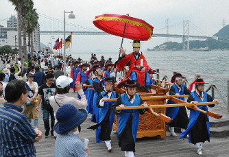 日韓関係が冷え込む中、江戸時代に朝鮮王朝が日本に派遣した外交使節団「朝鮮通信使」の行列が24日、山口県下関市で再現された。市民祭「馬関まつり」の恒例行事。姉妹友好都市の韓国・釜山市からも例年と同規模の市民約100人が行列に参加し、下関市民約60人とともに当時の装いで街を練り歩いた。