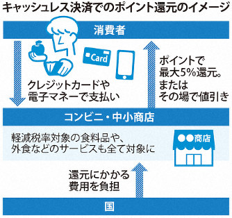 ポイント還元は、国に参加登録した中小事業者の店舗でクレジットカードやスイカなどのカード、スマートフ…