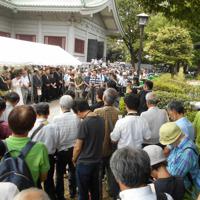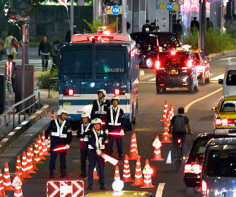 皇居周辺は朝から多数の警察官が巡回し、深夜まで大規模な交通規制が敷かれた。車両突入防止のため同庁のバスで塞がれた交差点もあり、終日、物々しい雰囲気に包まれた。【金森崇之】