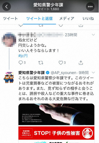愛知県警少年課は昨年10月、投稿に直接返信して注意を呼びかける取り組みを開始。公式アカウントから「見ず知らずの相手と会うことは、誘拐や殺人などの重大な事件に巻き込まれるおそれのある大変危険な行為です」「子供への性犯罪は極めて悪質な行為です」とメッセージを送り、注意や警告を促す。