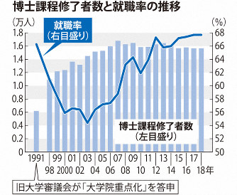 1990年代、国は「大学院重点化政策」を推進。研究力向上をうたい、大学院の定員を増やすもので、東京大を皮切りに広がった。少子化を見据えた経営面からの大学側の戦略、という側面もある。博士課程修了者(満期取得退学者も含む)は91年の6201人から2006年には1万5973人と15年間で約2・5倍に増えた。さらに国は、第1期科学技術基本計画(96~00年度)で「ポストドクター(ポスドク)等1万人支援計画」を打ち出し、研究人材としてポスドクの量産を進めた。ポスドクとは博士号を取得した後、公的資金から給与を得る任期付きの研究員で、主に理系分野で研究の人手不足を補う一方、就職難の博士の「受け皿」という意味合いもあったとされる。