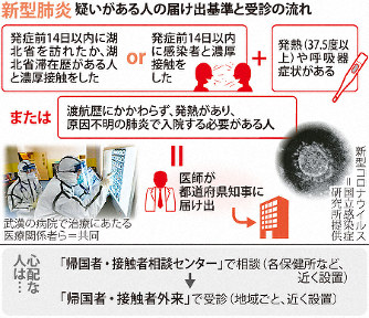 A 政府は、受診希望者の相談を受け付ける「帰国者・接触者相談センター」や、感染が疑われる患者を専門に治療する「帰国者・接触者外来」の設置を、各自治体に依頼した。中国の湖北省に滞在後、2週間以内に発熱や呼吸器症状がある場合など、心配な人は近く設置される相談センターなどで相談し、この専門外来で受診できるようになる。