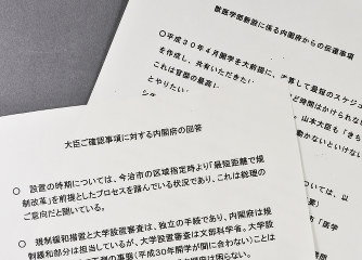 Another document, referring to the education minister, is titled "Cabinet Office's response to the minister's items for confirmation." It stated, "Regarding the setup process... we are working on the premise of 'regulatory reform over the shortest route,' and we have heard that this is the will of the prime minister." The same document stated, "If we present it as a decision of the advisory council on strategic special economic zones, it would appear as an order from the prime minister as he is head of the council. Looking toward opening the department in April of the 30th year of Heisei, it is necessary to bring the matter before the advisory council in early or mid-November."