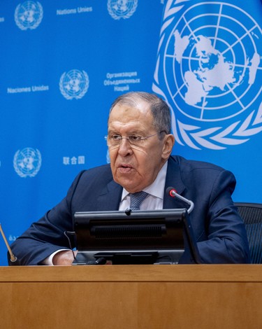 Foreign Minister Sergey Lavrov told a U.N. news conference that this new military bloc brought together by the United States is building up military activity and conducting large-scale exercises.
