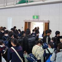 伊賀市上野丸之内の上野高校(伊賀市上野丸之内)の合格発表では、新型コロナウイルス感染予防策として、体育館の壁に約10メートルずつ離して合格者の番号を記した紙5…