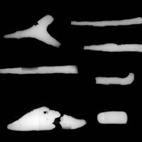 岩手県奥州市の白鳥舘遺跡から出土した小刀(左上)やくぎ(右の上から2番目)のX線写真。見た目は修復されていたが、X線写真で…