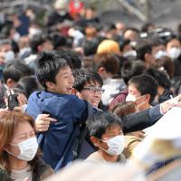掲示板の受験番号を確認し、喜ぶ受験生ら=福岡市西区の九州大伊都キャンパスで2020年3月8日午前11時2分、津村豊和撮影