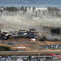沿岸の防風林を越えて押し寄せ、住宅などを一気にのみ込む大津波=宮城県名取市で2011年3月11日午後3時55分、本社ヘ…