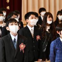 卒業式でマスク姿で合唱する児童たち=福岡市南区若久3の市立東若久小学校で2020年3月17日午前10時19分、佐野格撮影