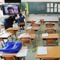 子どもたちのいない教室で自宅にいる児童の学習支援をする教師=熊本県高森町の高森中央小で2020年3月17日、津村豊和撮影