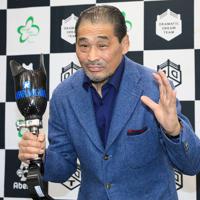 プロレス専用に作られた義足を手にファイティングポーズをとる谷津嘉章さん=東京都渋谷区で2020年3月18日午後、梅村直…
