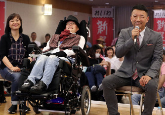 当選確実となった舩後靖彦氏(中央)とインタビューを受け、笑顔を見せるれいわ新選組の山本太郎代表(右)。左は介助者の佐塚みさ子氏=東京都千代田区で2019年7月21日午後9時58分、小川昌宏撮影